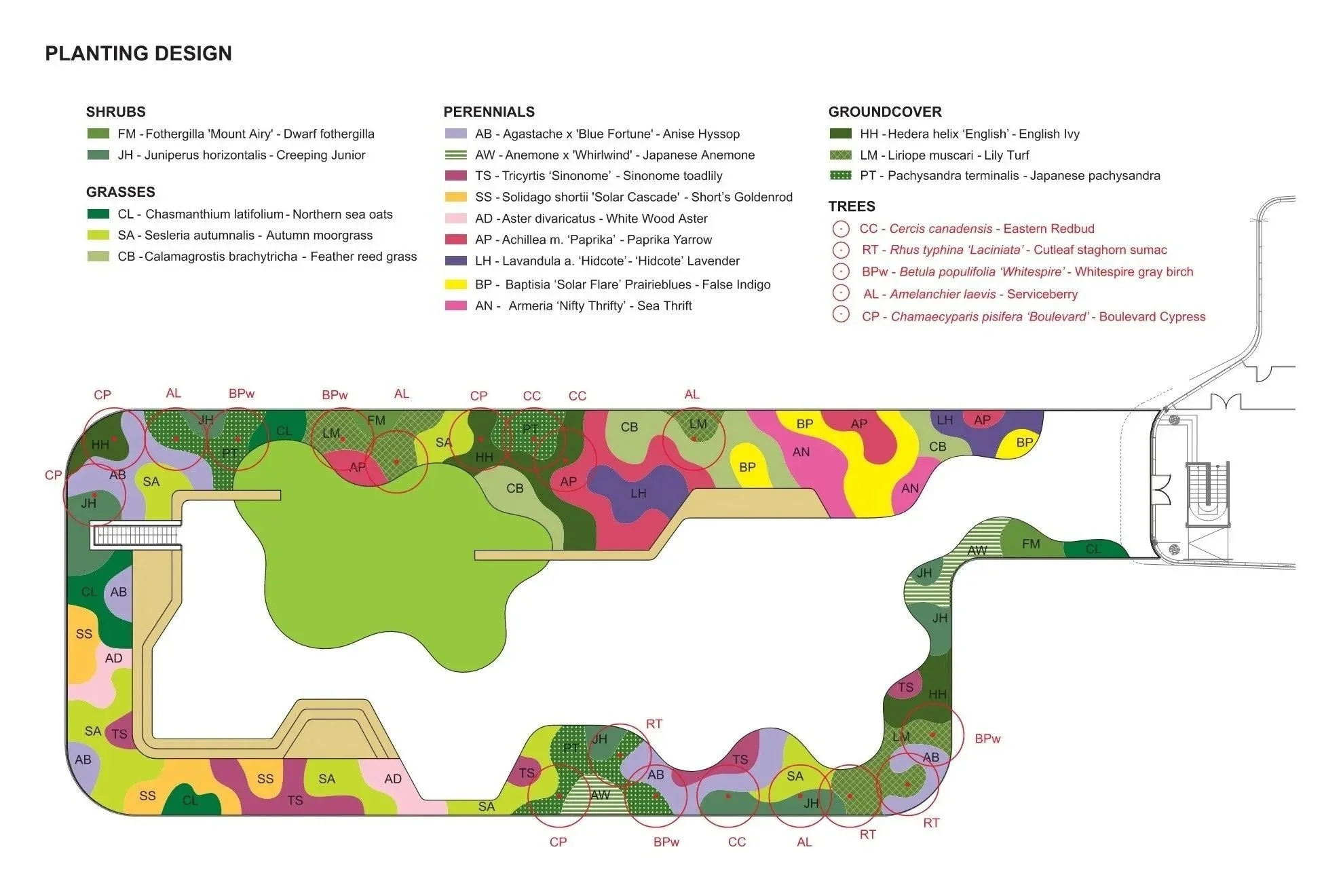 Supermass Studio designed a lush, resort-inspired roofdeck for Allure 258, transforming the podium rooftop into an elevated outdoor retreat for residents. The landscape is organized around a flowing central green and a series of sculpted wood seating terraces that shape intimate pockets for lounging, dining, and casual gathering. A mix of ornamental trees, layered shrubs, and seasonal perennials—visible throughout the perimeter garden shown in the schematic plan and planting design—creates a rich, park-like edge that softens the building’s modern architecture and frames long views across the site.