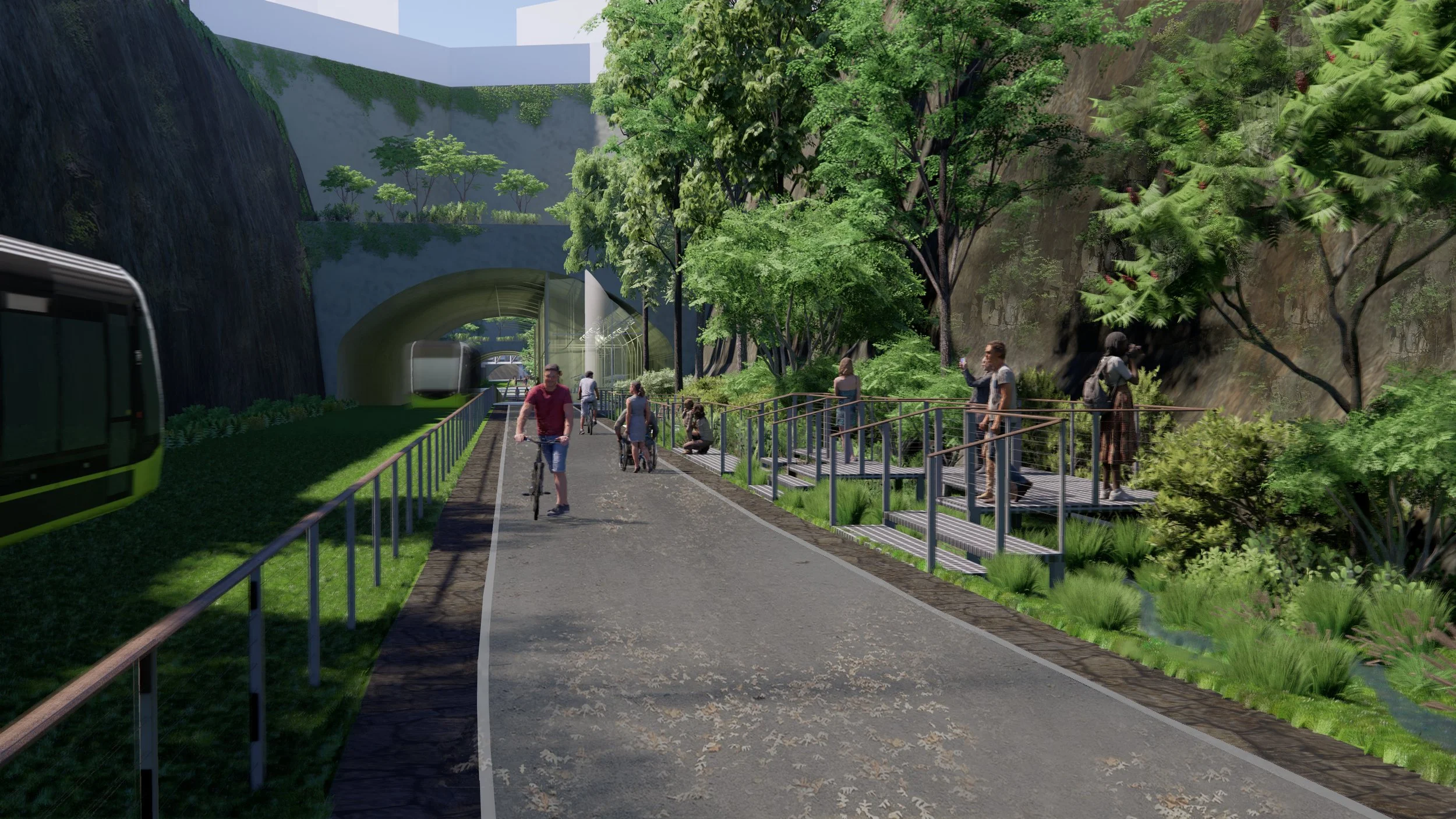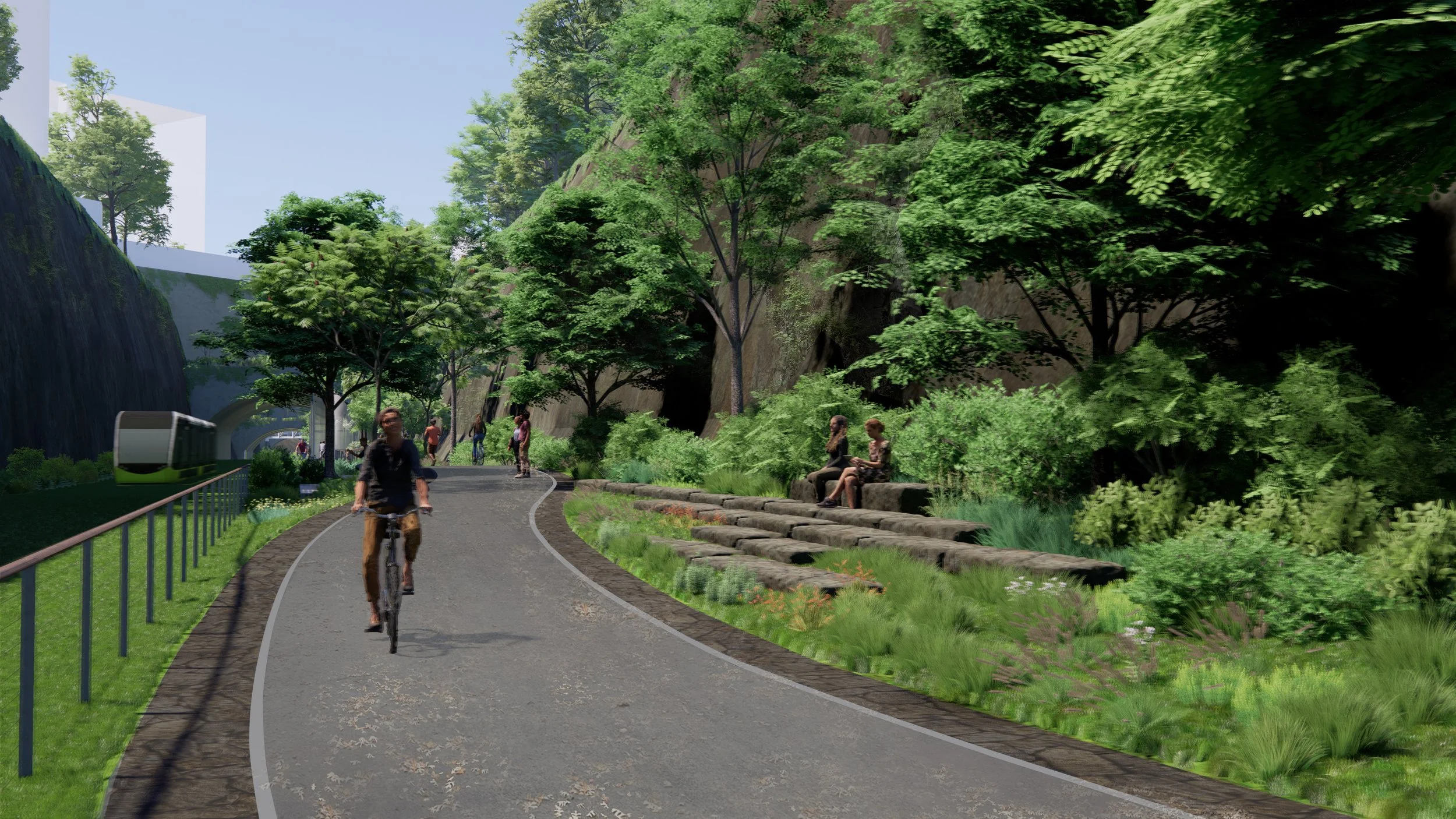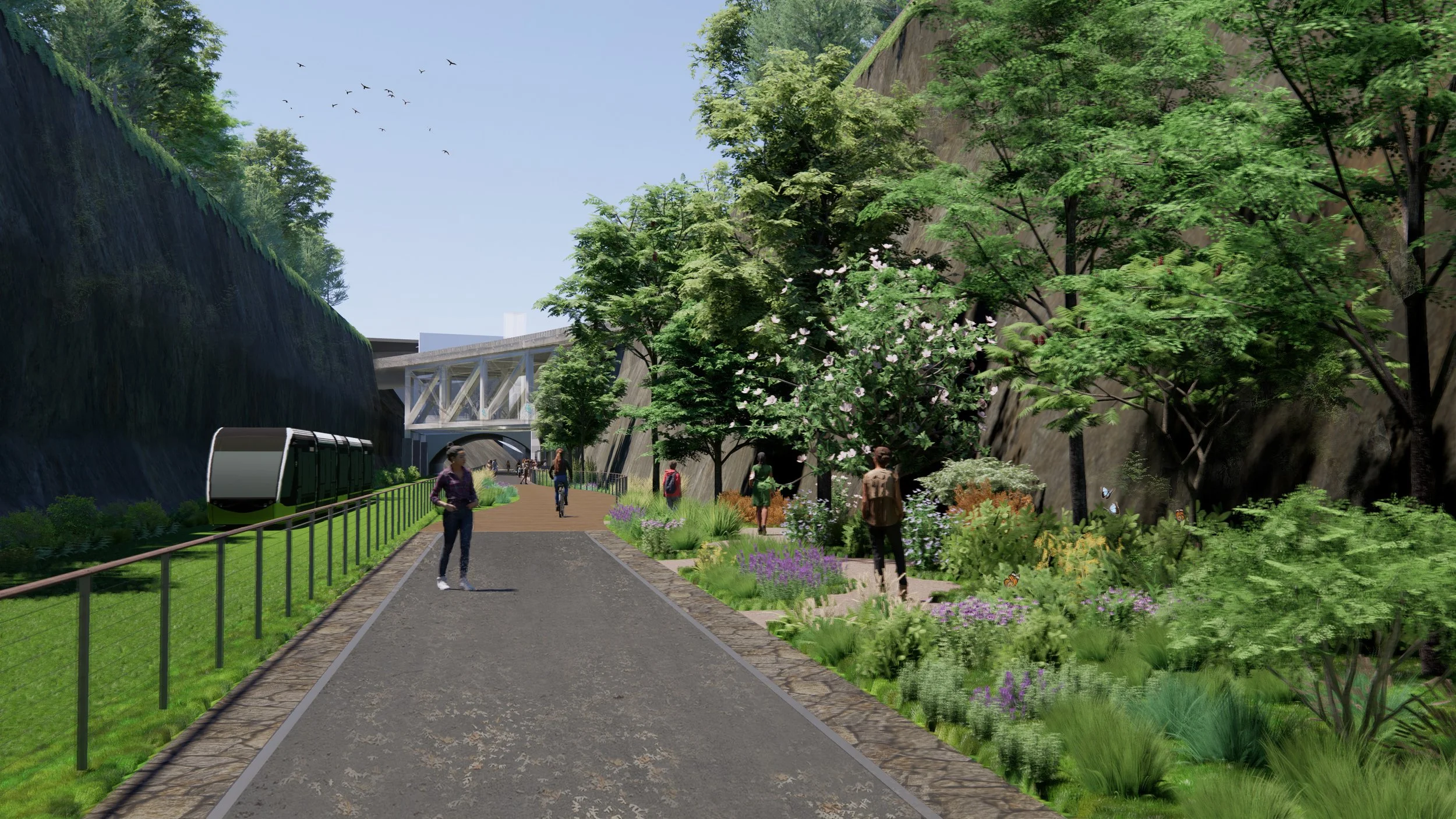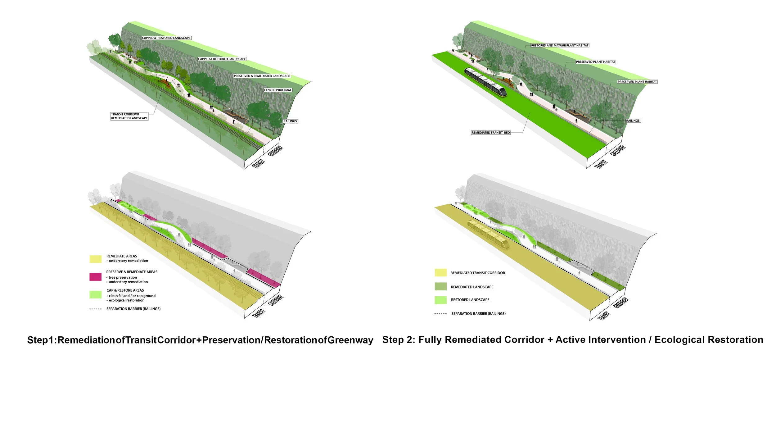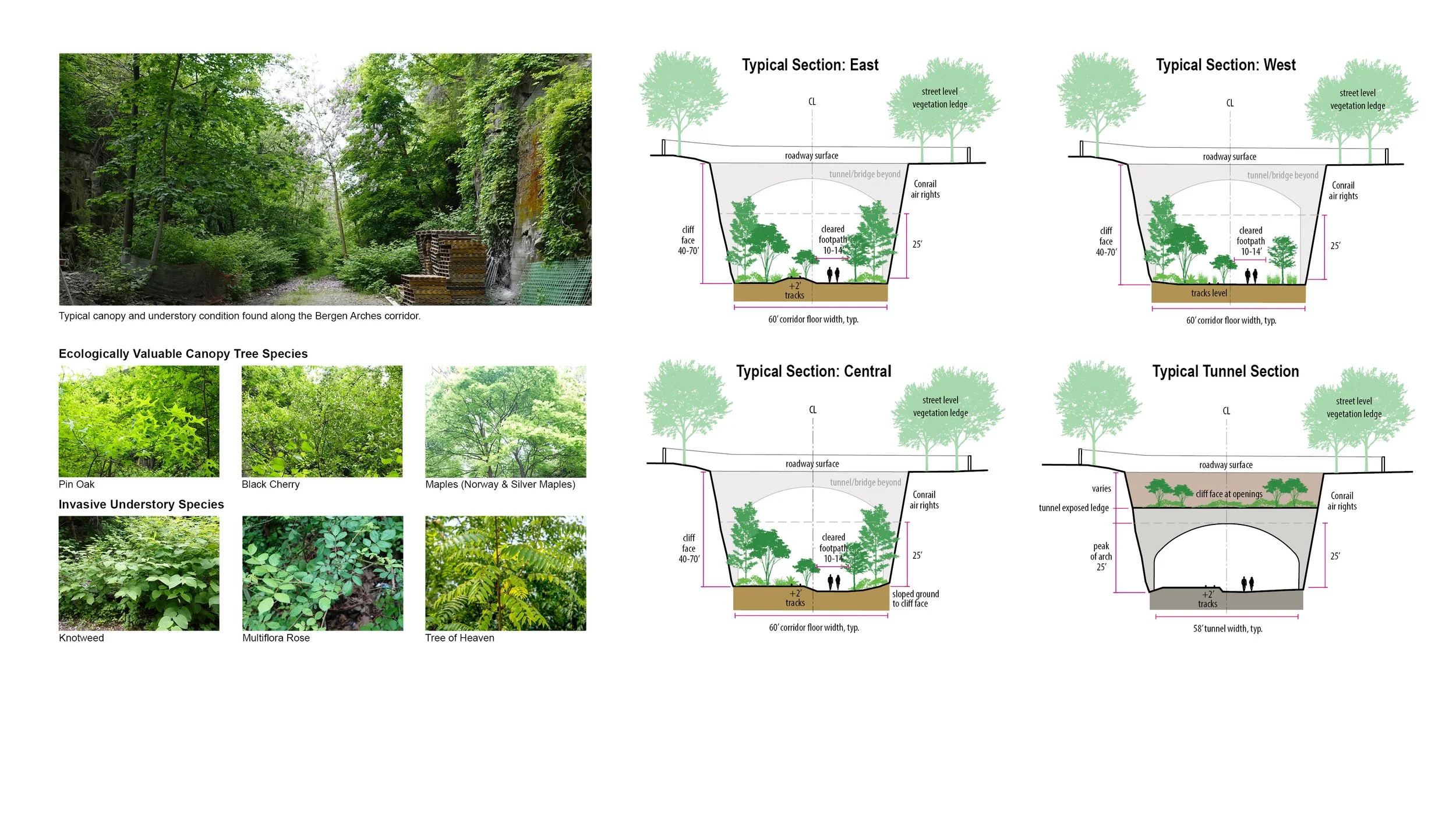 Bergen Arches is a 60’ wide, 1.75 mile long historic and abandoned depressed rail corridor that was completely taken over by nature since its abandonment 60 years ago. Supermass Studio was commissioned to conduct the feasibility study to convert this historic rail corridor into a new model of greenway public space that can coexist with the reintroduced sustainable public transit. The new greenway proposes to strike a balance between the preservation of the existing vegetation, introduction of new green space as public amenities, while creating a pedestrian compatible new mobility model for future transit.