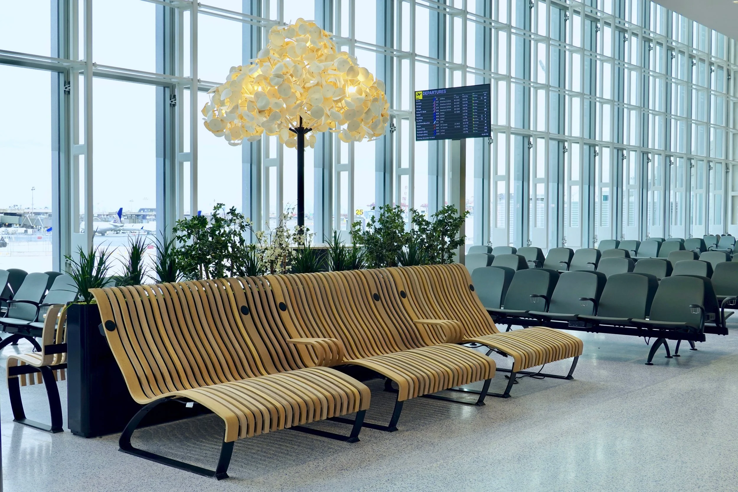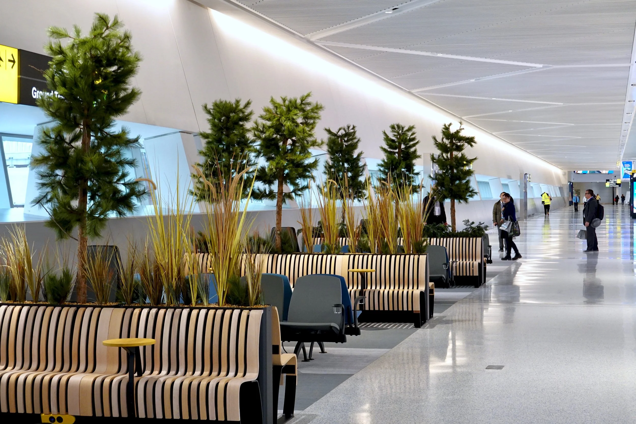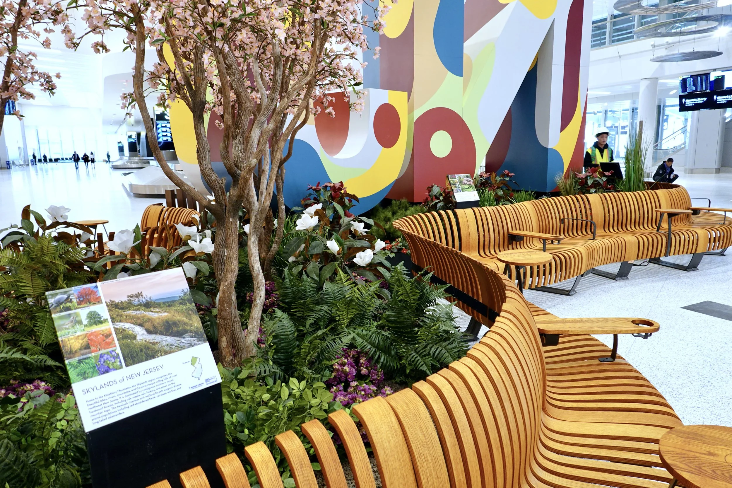 Supermass Studio was commissioned to bring lively, dynamic landscapes to the new EWR Terminal One holdrooms and Welcome Center. The design concept reinterprets New Jersey’s five distinct landscape regions throughout the terminal. In the holdrooms, plantings are integrated into immersive “people watcher” planters, while the Welcome Center features an oversized, state-shaped planter with seating. Each planting zone reflects regional ecologies, supported by interpretive signage. Supermass Studio provided full-scope services, from concept design and bid documentation to construction administration.
