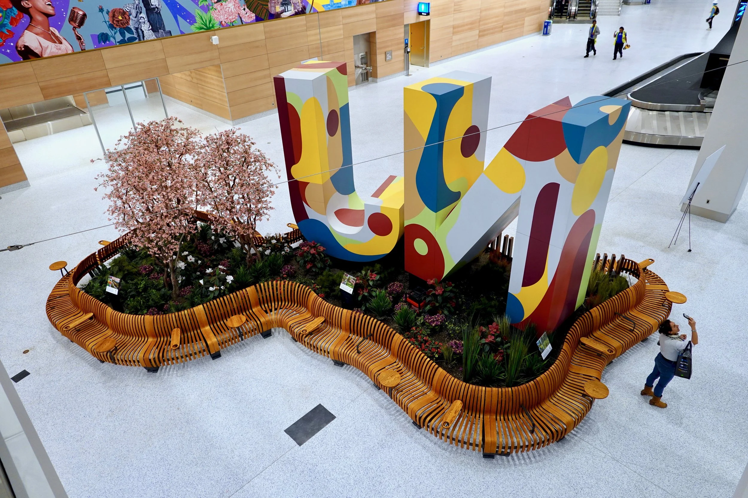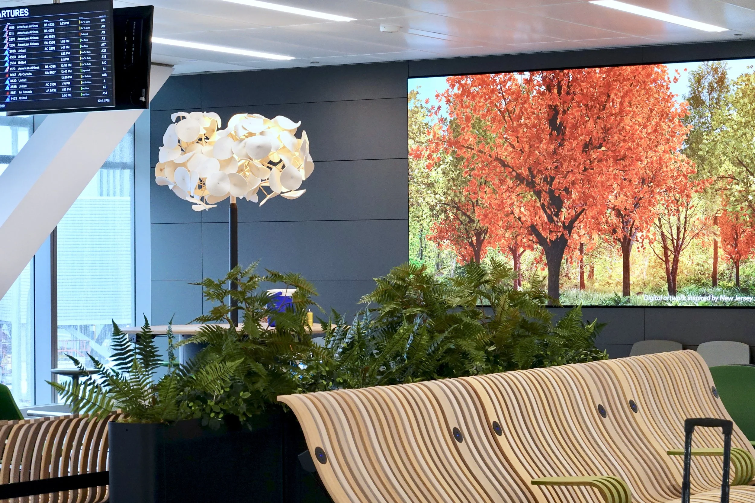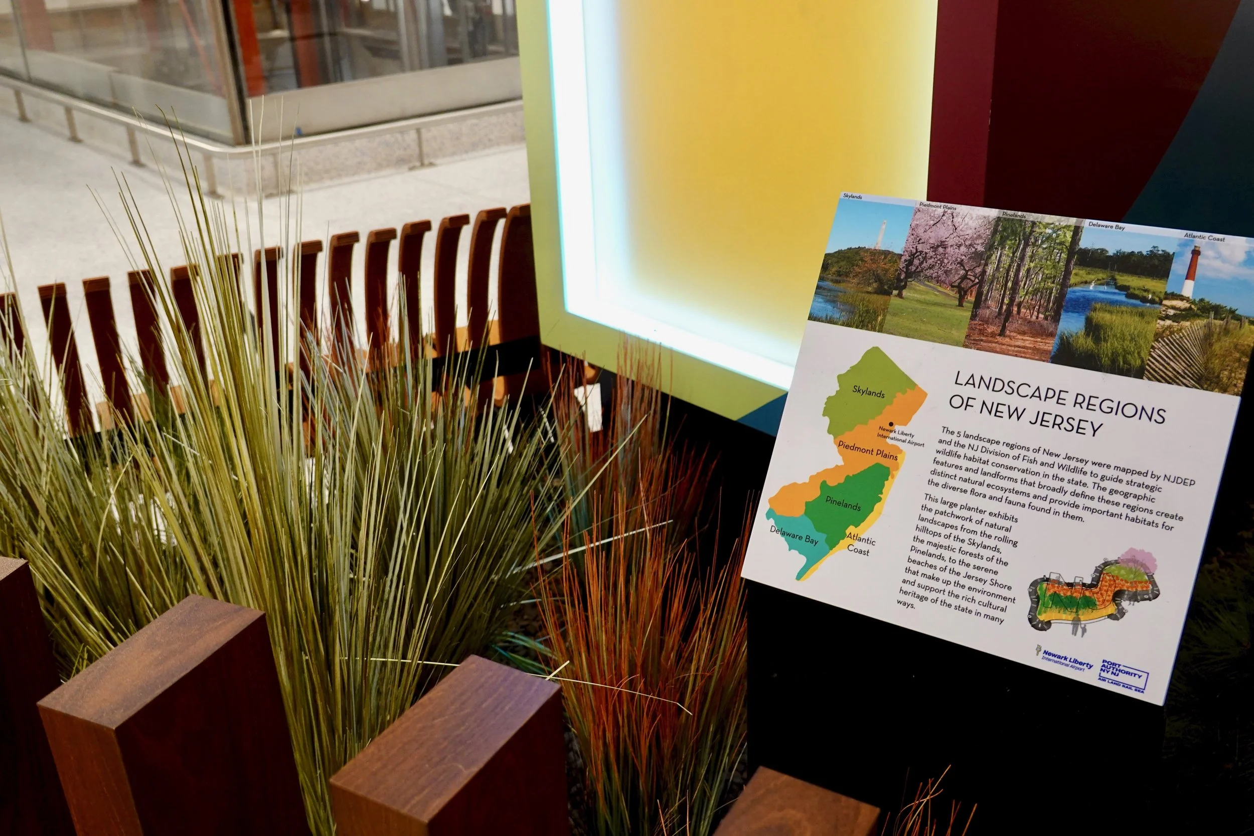 Supermass Studio was commissioned to bring lively, dynamic landscapes to the new EWR Terminal One holdrooms and Welcome Center. The design concept reinterprets New Jersey’s five distinct landscape regions throughout the terminal. In the holdrooms, plantings are integrated into immersive “people watcher” planters, while the Welcome Center features an oversized, state-shaped planter with seating. Each planting zone reflects regional ecologies, supported by interpretive signage. Supermass Studio provided full-scope services, from concept design and bid documentation to construction administration.