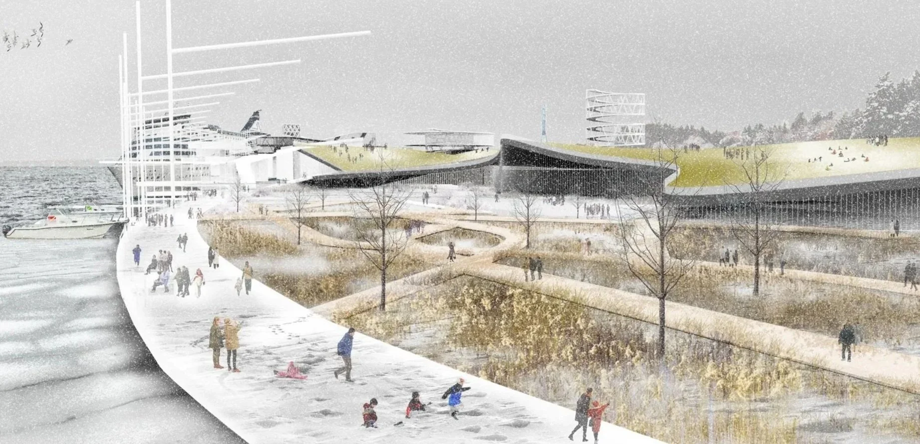 Revontulet (Northern Lights) is a natural light phenomenon which occurs in the skies of high latitude regions, caused by the collision of various energetically charged particles coming in contact with each other in the atmosphere. Similarly, the main goal of the Revontulet Helsinki South Harbour Master Plan is to create moments of generative fusion between different social, cultural and environmental conditions, resulting in an energetic and beautiful attraction that activates the South Harbour as an enjoyable and accessible waterfront for both city residents and visiting tourists, all while maximizing access to the oceanfront along the boardwalk and maintaining the efficiency of the port functions. Park-like planted deck partially covers the existing cargo yard and coexists with all of its harbour operations below while creating a new public space on the harborside with direct access to water