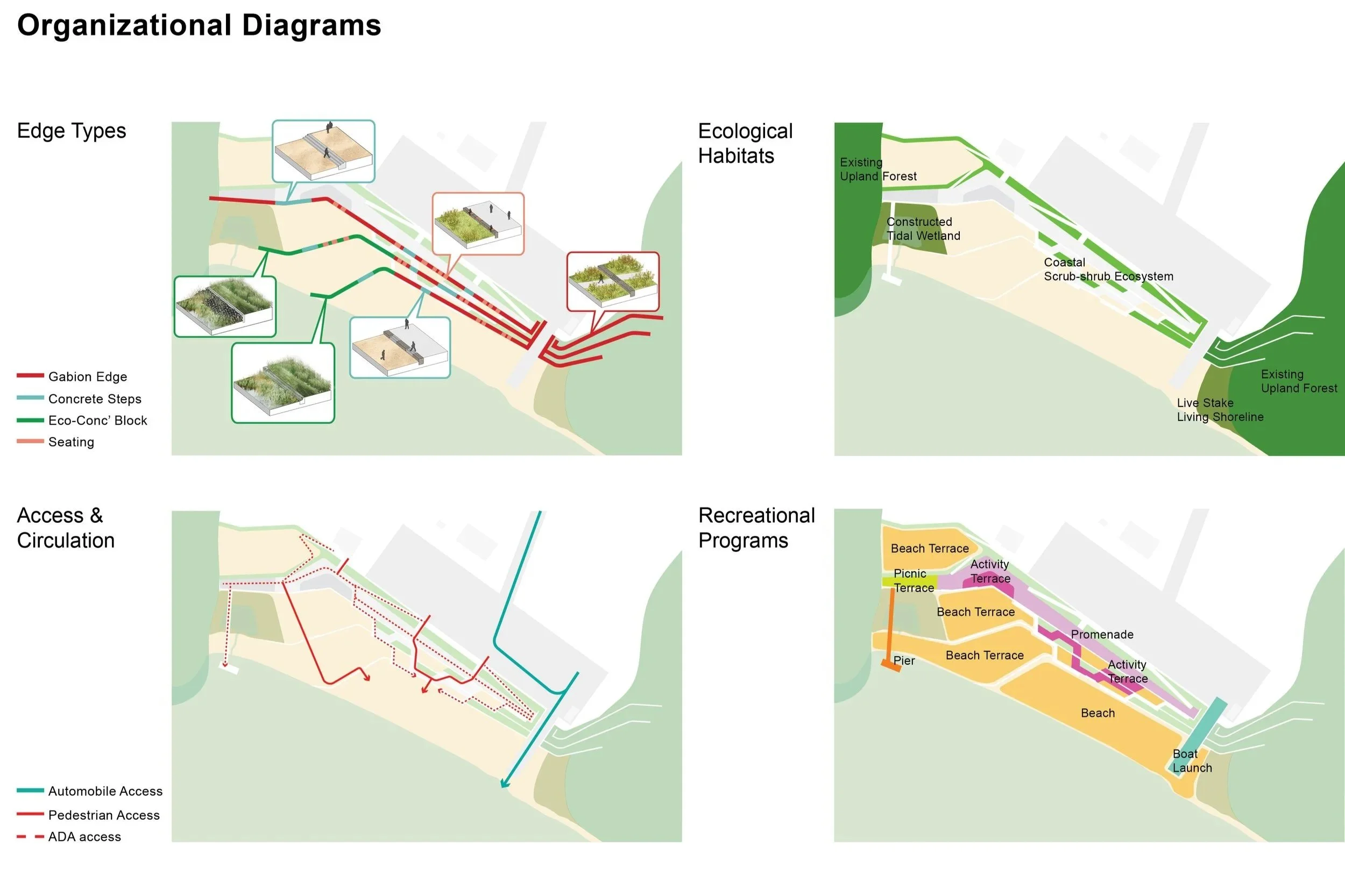 Building on the 2017 Cornell Climate Adaptive Design Studio, the Kingston Point CAD project evaluated sea level rise scenarios and their impacts on the City and the Hudson River estuary. Supermass Studio was commissioned to develop a flood mitigation and resiliency strategy that balances ecological health, recreation, and community needs. Through stakeholder engagement, Kingston Point Beach was identified as the most feasible demonstration site. The project explores creating living shorelines, restoring and managing habitats, integrating educational programs, and designing the beach as an adaptive feature for rising seas. It also proposes tidal wetland restoration and an interpretive trail connecting key park areas.